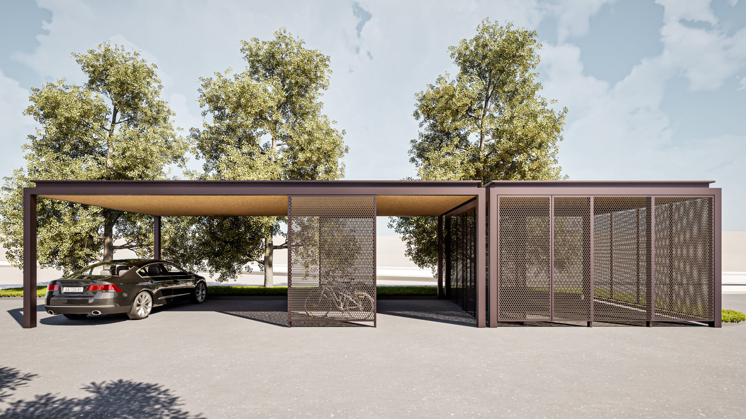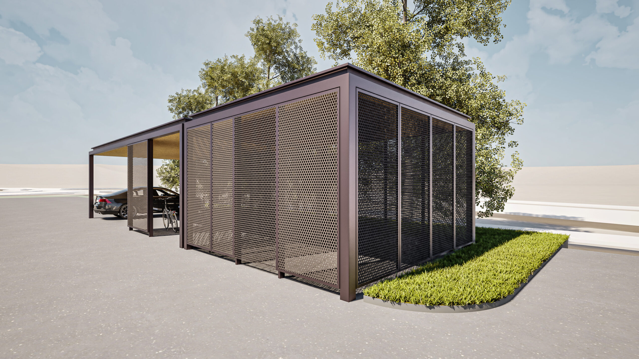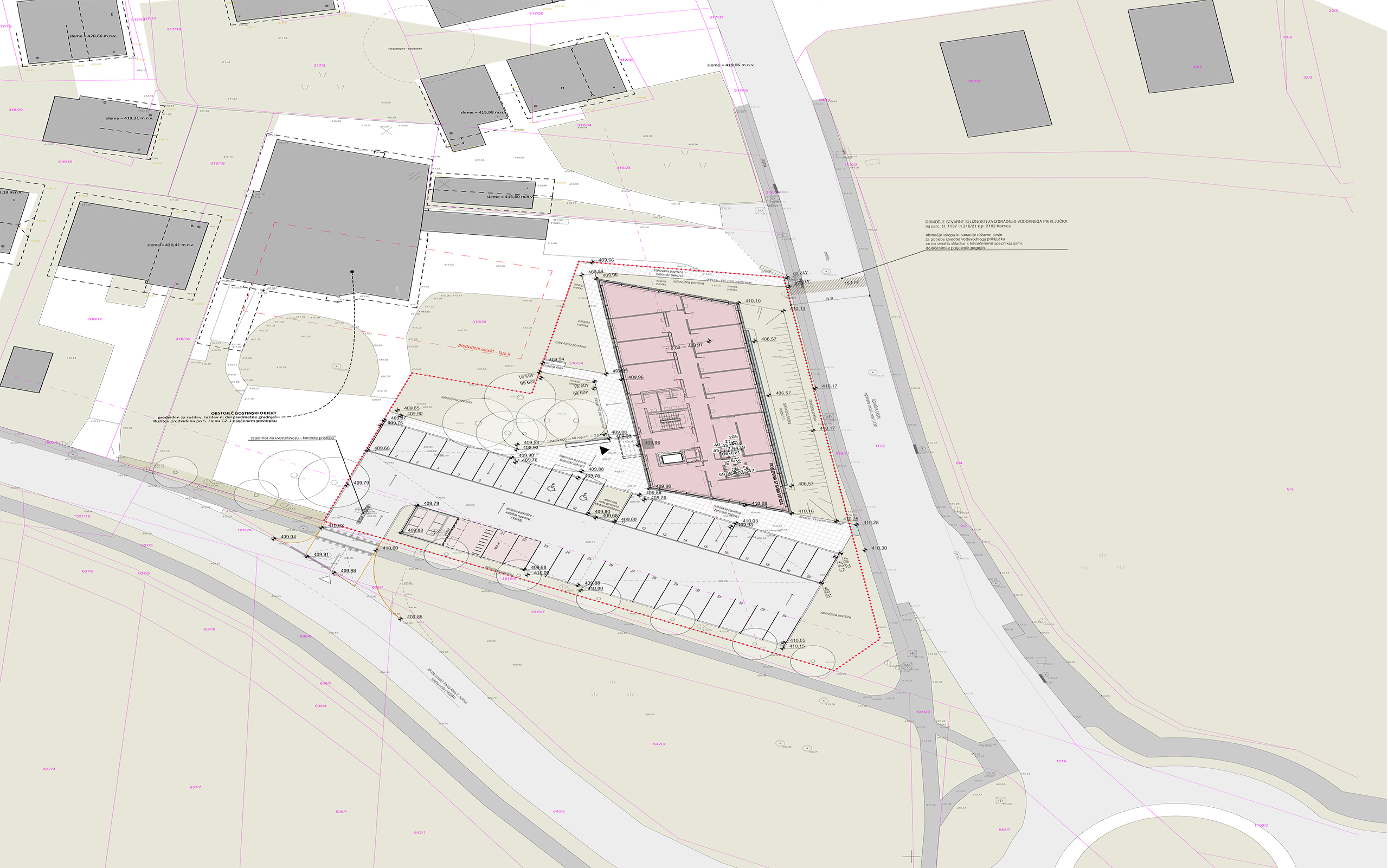 Okolico stavbe krasi gruča obstoječih dreves, na južnem robu pa bo urejeno lastno parkirišče, obdano z nizom strnjenega drevoreda.